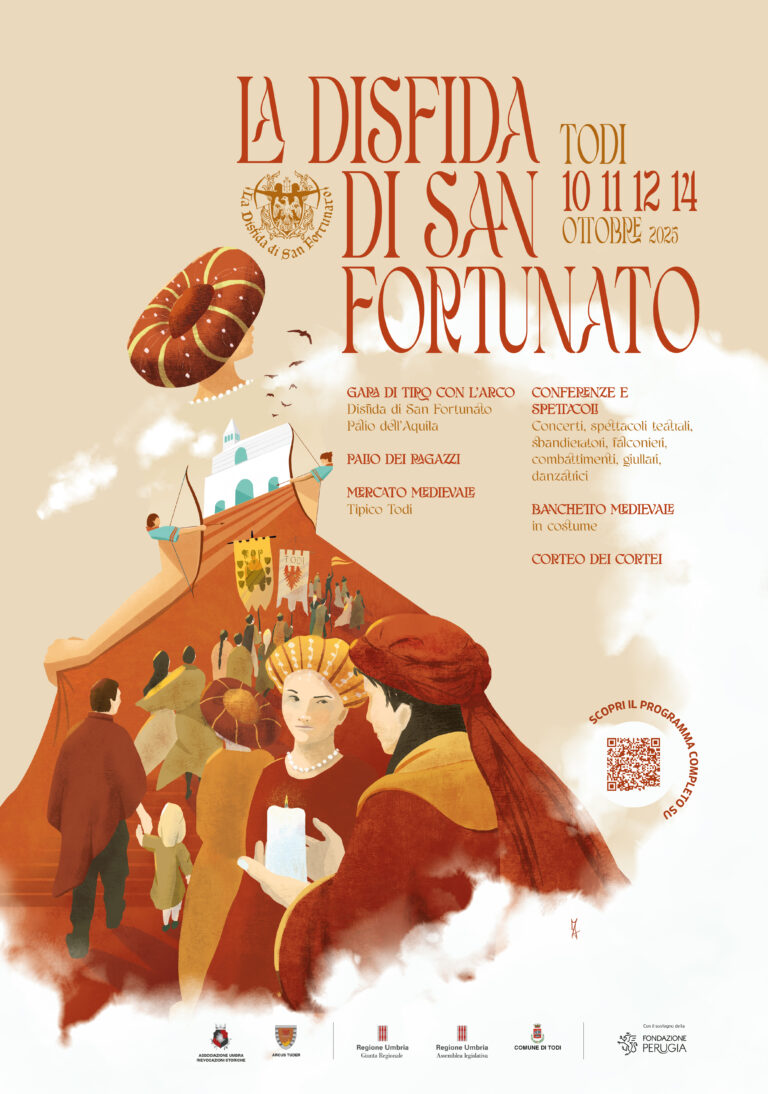 Gare di tiro con l’arco storico, combattimenti medievali, spettacoli di giullari, falconieri, tamburini e sbandieratori, un lunghissimo corteo storico tra le vie del centro della città di Todi. Sono questi gli ingredienti principali de «La Disfida di San Fortunato», la tradizionale festa medievale che a metà ottobre anima per alcuni giorni tutta la città, in occasione della festa del Patrono, San Fortunato, celebrata il 14 ottobre.